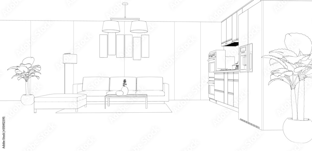 Sketch Of Modern Kitchen And Living Room Interior 3d Rendering Stock Illustration Adobe Stock